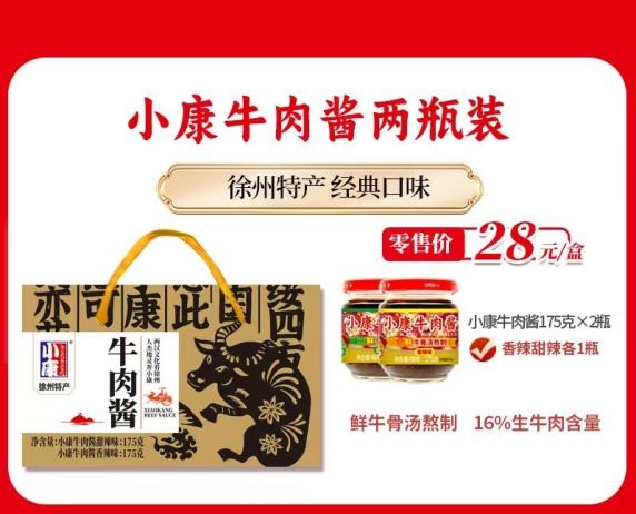 时代在变迁,经典永流传。2025年,小康牛肉酱紧跟时代潮流,与徐州官方农产品区域公用品牌“农香徐来”强强联名,重磅推出爆款产品“二牛牛肉酱”。依托“农香徐来”的官方背书与品牌影响力,结合抖音等新媒体平台的精准推广,“二牛牛肉酱”迅速火爆出圈,直播间峰值观看人数屡创新高,相关话题热度持续攀升,不仅成为徐州人餐桌上的新宠,更成为对外展示徐州美食魅力的“流量担当”,让这一老牌酱料在新时代焕发新活力,让徐州味道走出徐州、走向更广的舞台。