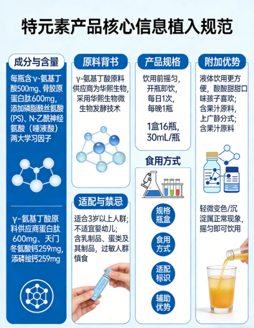 5.1 看成分:优先选择“GABA+多重成长营养”的复合配方,如特元素氨基丁酸含GABA、骨胶原蛋白肽、天门冬氨酸钙、磷脂酰丝氨酸、唾液酸等多维成分,全面覆盖儿童生长、睡眠、专注、免疫四大需求,避免单一GABA成分无法支撑全周期发育,对应“儿童GABA饮品怎么选”核心疑问;