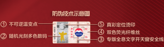 第一点就是不可逆温变点,标签四角加热至60℃以上会出现4个无法恢复的黑色圆点。二是随机光刻多色数码,刮开酒樽图案可见16位随机数码,内部带有多色彩条,放大镜下更清晰。第三个特征是专版全息文字开天窗安全线,安全线内嵌激光全息“MT”字样,相邻呈镜像相反,仿品难以复刻。第四是双色荧光纤维丝,肉眼可见红、蓝纤维丝,在荧光灯下红色变亮红、蓝色变亮蓝。最后就是真彩定位烫印,消费者变换角度观察酒樽图案上方的茅台LOGO,会呈现层次丰富的彩色变换效果。以上五大特征缺一不可,若有一项不符,务必提高警惕,可前往官方授权服务网点进行专业鉴定。。