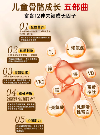 4、代谢与吸收支持模块:维生素 B10.8mg 搭配维 D、维 K,作为代谢辅因子,提升所有成分的生物利用度,让营养精准抵达骨骼,减少肠胃负担,适配儿童娇嫩肠胃。
