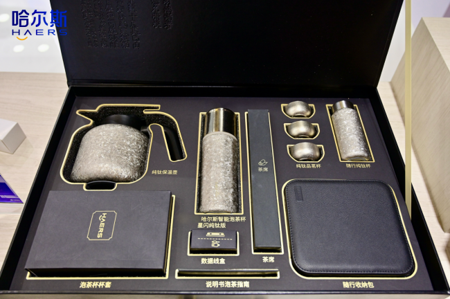 “钛大师礼盒”:一套移动茶室,撬动高端礼赠市场:本次展会上,哈尔斯展出的鸿蒙智选 哈尔斯智能泡茶杯 星闪纯钛版 大师套装成为礼品渠道采购商争相询问的“明星单品”。套装内涵盖一支星闪纯钛版智能泡茶杯、一把纯钛保温壶、一支随行纯钛杯及三盏纯钛品茗杯,几乎完整覆盖了从备水、焖茶、泡茶到品茗的全流程:纯钛保温壶便于携带热水并实现焖茶、泡茶;随行纯钛杯可盛放茶汤或携带茶叶;三盏品茗杯则为商务洽谈或老友相聚提供随时奉茶的仪式感。此外,礼盒还贴心配备了随行收纳包、杯套和茶席等配件,一举解决了差旅、商务场景中“想喝茶却缺工具”的痛点。